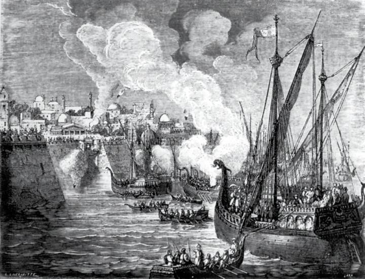 Statki pod Konstantynopolem, miniatura z połowy XIV w Konstantynopol, rycina z „Kroniki Norymberskiej”, koniec XV w. Widok Konstantynopola z XV w.